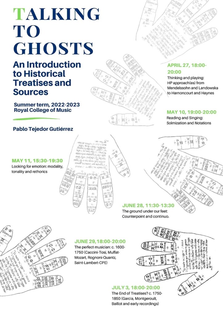 I created a whole seminar (titled Talking to Ghosts) of six two-hour sessions partly based partly on my personal research and covering the topics that are not taught in the other subjects (from basic solmization, notation, rhetorics and counterpoint to the historical pioneers of the field, early recordings or many other sources on instrumental and vocal playing). The different sessions are half practical and half theorical and I work with the undergraduate and postgraduate students on their solo and chamber music repertoire from a historical perspective.